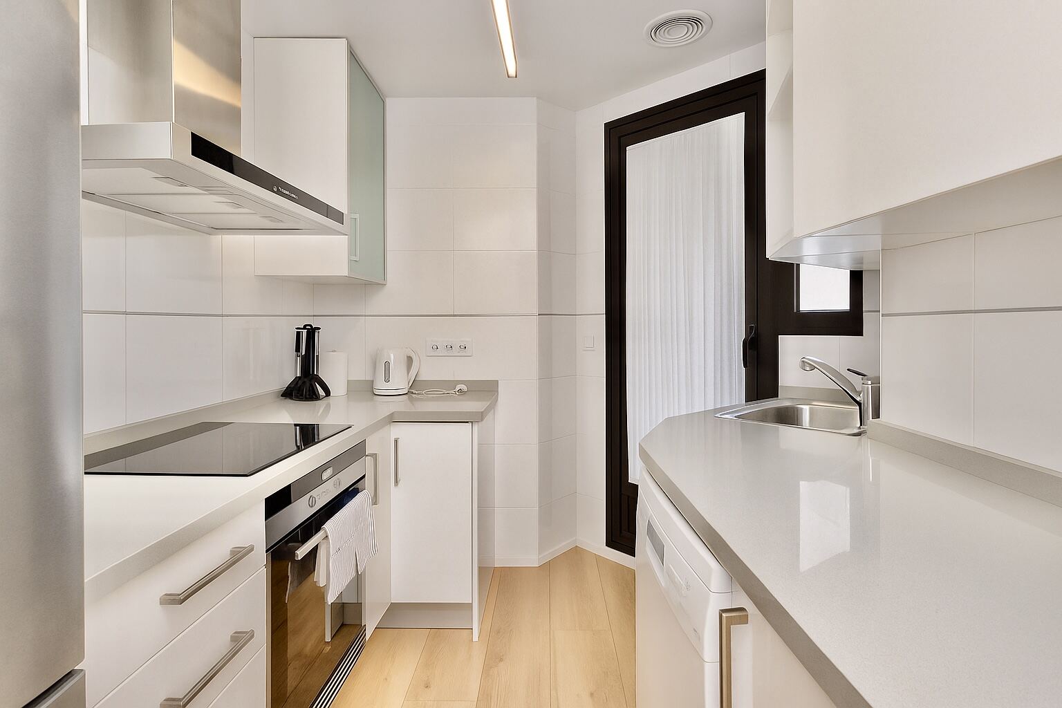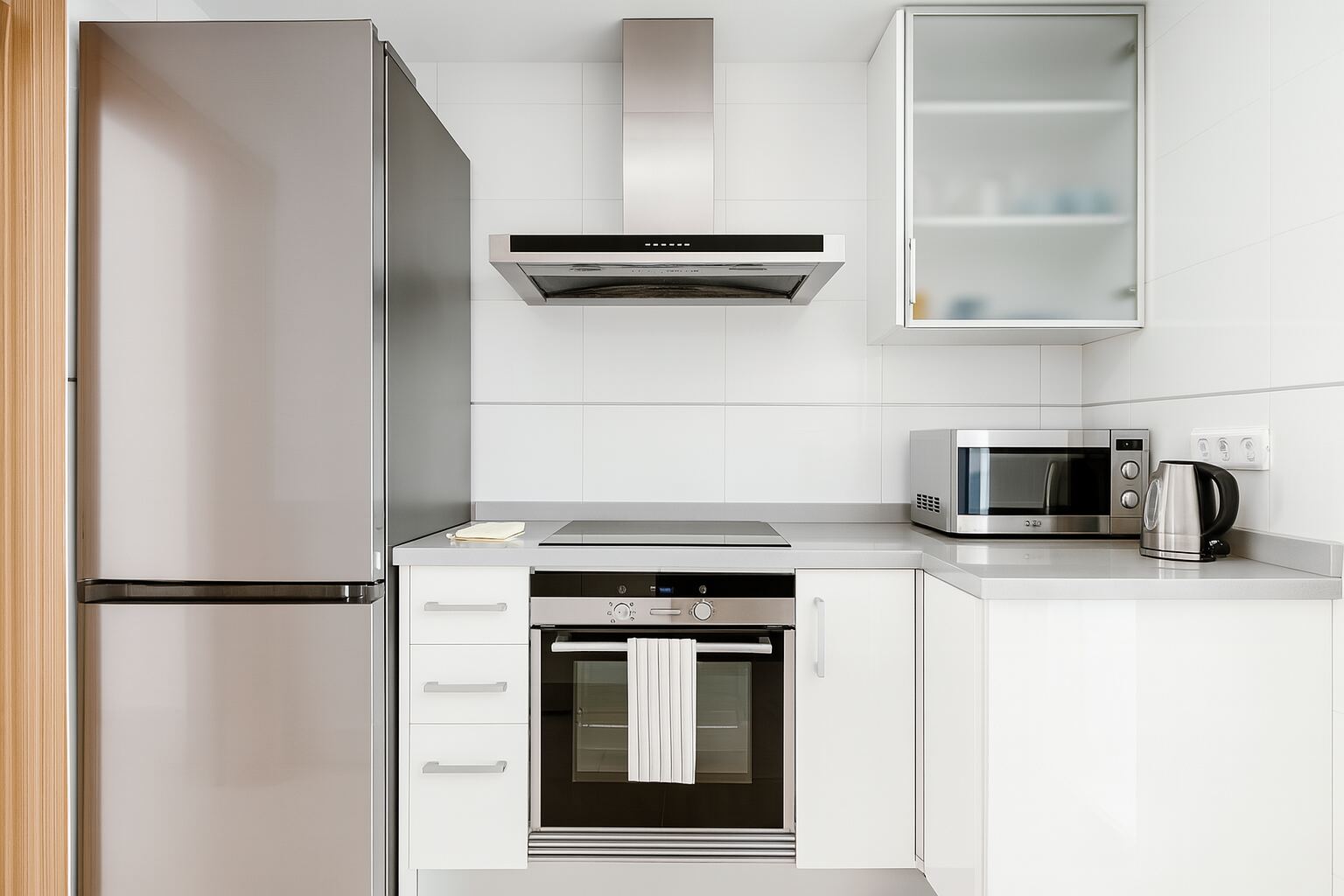 Cocina totalmente equipada con nevera, cafetera, hervidor y zona de comedor.